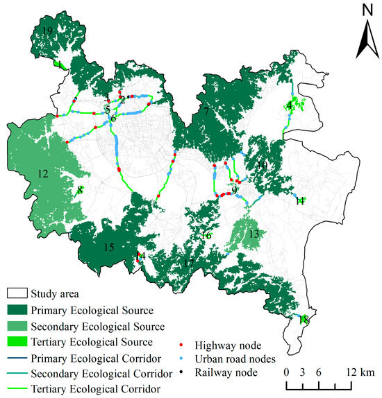 Our study classified the ecological corridors and ecological source areas in the central city of Fuzhou into three levels according to the natural discontinuity point method by using the current theory through the LinkageMapper module. Among them, there are six primary corridors, fourteen secondary corridors, and fifteen tertiary corridors and six primary source sites, six secondary source sites, and seven tertiary source sites. At the same time, the study intersected the ecological corridors with urban roads, highways, and railways in order to identify key nodes that impede the corridor connectivity, which resulted in the identification of a total of two hundred thirty-nine nodes of urban roads, ninety-one nodes of highways, and eight nodes of railways (Figure 11). In terms of spatial distribution, the primary corridor mainly connects the primary source area and part of the secondary source area, mainly distributed in the edge of the city, with an average length of 436.98 m. In the actual planning and design, the natural restoration should be taken as the main way to promote the integration between the adjacent primary source areas. As an important corridor connecting large ecological sources at the border and small sources within the city, the average length of the secondary corridor is 1150.80 m, and the integrity of the corridor should be guaranteed in the planning and design. For the nodes of some secondary corridors and road networks, the corridor design should adopt the sunken design to avoid the interference and destruction of road networks. The average length of the tertiary corridor is 6484.51 m, which plays the role of connecting the north and south ecological sources, and because of its long length, it has the most road nodes with the urban area. In the planning and design, the tertiary corridor should be attached to the city road, belt green space, and the river areas along the Min River and Wulong River as much as possible. For corridors that are too long, existing green space resources should be integrated, and the role of urban parks and street green spaces as stepping stones should be utilized to enhance the overall connectivity of the ecological corridor. For areas that are difficult to change, designs such as vertical greening and rooftop gardens can be implemented to reduce the negative impact of construction land on the ecological corridor. At the same time, ecological corridors can be organized and connected through landscape green belts, plant landscape belts, and bicycle and walking paths. Finally, for the ecological source areas in the downtown area of Fuzhou City, the red line of the 19 ecological source areas will be strictly regulated, and the internal quality of the source areas will be improved by increasing the vegetation cover and enriching the three-dimensional structure of the vegetation canopy. Protective buffer zones should be set up in the bridging and edge areas around the ecological source areas to reduce the negative impacts caused by human activities.