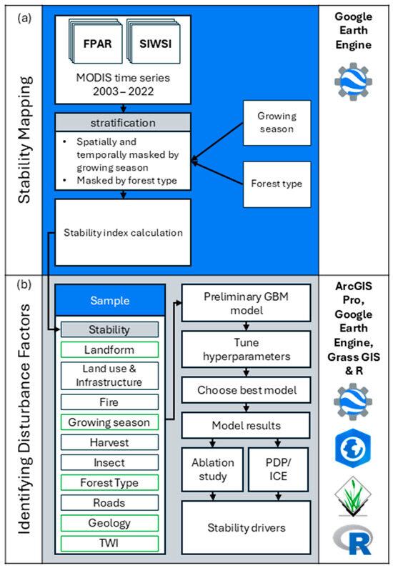 The analytical workflow used in this study. The two main analysis stages are shown on the left-hand side of the figure: the stability mapping stage (a); and the identifying disturbance factors stage (b). A description of each step in the workflow is given in the center, and the computer program or programming language used is given on the right.