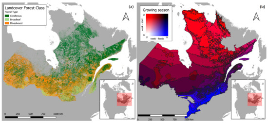To account for different forest types and phenology, we spatially stratified this study region, focusing solely on forested areas. Non-forest areas were excluded using a 30 m pixel resolution land cover dataset from 2019 [23]. We further stratified forest cover into coniferous, broadleaf, and mixed-wood areas, downscaling and reprojecting the data to match the MODIS projection in Google Earth Engine [24] (Figure 3a). The command ‘reduceResolution’ was used to downscale the data with the mode reducer and reproject using the ‘reproject’ command. The stability index calculations were confined to analysis of fPAR and SWISI during the months of the year that correspond to the growing season. However, the start, end, and length of the growing season vary across this study region with latitude. Thus, we classified pixels by their growing season start and end weeks based on 2020 gridded data [25] (Figure 3b).