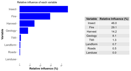 Five non-disturbance environmental variables were also shown to be spatially correlated with stability index values, listed in order of importance: geology, TWI, landform, roads, and (non-forestry) land use (Figure 5, Figure 6 and Figure 7). When the human and natural disturbances are removed from the GBM modeling, geology, TWI, and landform are the two more important variables (Figure S8). Previous studies have shown that TWI and landform are related to landscape level gradients in forest flammability and susceptibility to insect infestation, as well as forest site productivity and hence locations more likely to be logged [3,44].