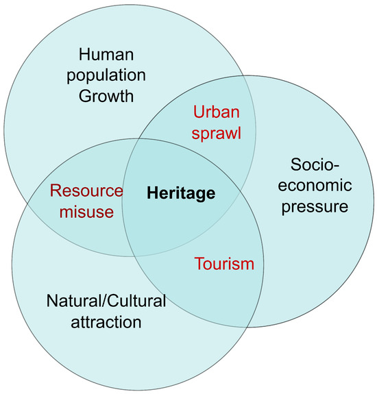 In terms of the ongoing and expected rapid urbanization, which is reflected through physical urban development, “how much change is taking place in heritage properties?” is an important question to explore [13,14]. The impact of urbanization on heritage is significant, leading to the physical destruction, permanent alteration, and arbitrary reconstruction of historic areas. This phenomenon is not confined to specific locations, and even protected areas may be affected [15]. The drivers of urbanization, such as urban development, human population growth, natural/cultural attractions, and socioeconomic growth, are significant in helping cities thrive. However, the intersection of human population growth and natural/cultural attractions can lead to resource misuse. Additionally, population growth and socioeconomic pressure can result in urban sprawl, and the interaction between natural/cultural attractions and socioeconomic pressure promotes tourism expansion. If these and many other interactions overlap, they may cause significant damage to heritage properties [16]. If left unchecked, the resulting activities, such as the construction of more buildings, transportation infrastructure, and environmental pollution, threaten the conservation of cultural heritage properties, leading to the potential loss or degradation of areas with cultural significance [6] (Figure 1).