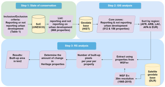 This research analyzed the geographical information of 668 WH properties. These properties were matched to the results of the state of the conservation report in Step 1. The matching process resulted in excluding properties that had no geographical information that they reported on urban development. The final result of this step was two categories of properties, all with available geographic information: those reporting on urban development and those not reporting on urban development and that had matches in the 668 geodatabases. Properties that reported on urban development but did not have available geographic information were excluded from further analysis.