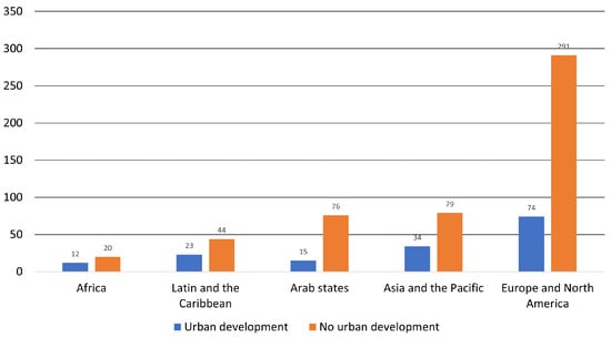 The study results suggest that approximately one-third (426 out of the total) of the heritage properties report on urban development. Regions such as EUR have the highest documented number of properties reporting on urbanization, followed by APA. This finding aligns with the broader consensus because these regions have high heritage area coverage, high urbanization rates, and increased urban development projects, such as housing, transport infrastructure, and power network installation [51,52].