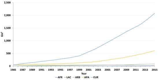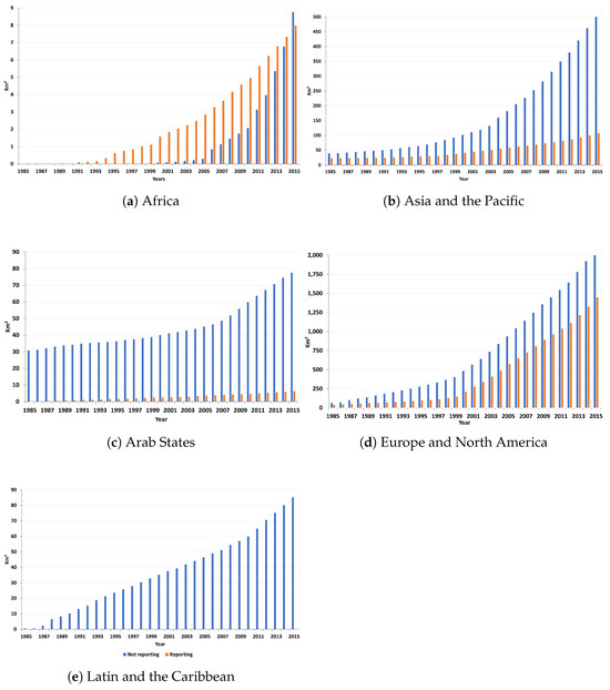 Figure 8 show the results of the relative comparison per region in heritage coverage for properties reporting and not reporting on urban development. From the figure, it is clear that EUR has experienced a significant change in built-up areas, followed by APA. Specifically, Figure 8a shows that AFR experienced a significant increase in urban built-up areas in both categories, while in the recent two years, the properties not reporting exceeded the built-up areas of the properties reporting on urban development. The properties not reporting on urban development had strong growth, from 0.0 km2 in 1985 to 0.1 km2 in 2000 and 8.8 km2 of built-up areas in 2015. On the other hand, the properties that reported on urban development in 1985 also had no change 0.0 km2, while the first growth was seen in 1991 with about 0.10 km2, which then increased to 80.0 km2 in a built-up area in 2015.