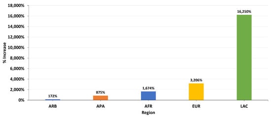 Figure 5 shows that the EUR and APA had almost similar built-up area increases in 1985, but this changed drastically starting in 1987. Specifically, the EUR increment in built area rose from 63 km2 in 1985 to 2080 km2, while APA increased from 62 km2 in 1985 to 608 km2 in 2015. ARB also experienced a steady increase year over year from 31 km2 in 1985 to 84 km2 in 2015. AFR and LAC experienced the least increments in built-up areas. For LAC, in 1985, the built-up area increase was 0.5 km2, while in 2015, it increased to 85 km2. On the other hand, in AFR, no increase in the built-up area was observed in 1985, while 17 km2 of the heritage coverage changed to the built-up area in 2015. Furthermore, Figure 6 compares the percentage increase in built-up area from 1985 to 2015 for each region. The figure indicates that the LAC region experienced a significant increase of approximately 16,250% in built-up areas between 1985 and 2015. This was followed by the EUR region with a growth of 3206%, AFR with 1674%, APA with 875%, and ARB with 172%.