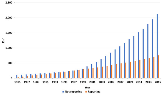 Figure 8b shows that APA also significantly increased in built-up areas during the period of analysis. For this region, the properties that were not reported significantly increased in the built-up area from 40 km2 in 1985 to 501 km2, representing a 1150% change. Properties that were reporting on urban development had a lower but steady increase in built-up areas from 23 km2 to 108 km2 during the period compared to the properties not reporting. This represented a 369.57% increase in built-up areas for the properties reporting on urban development.
