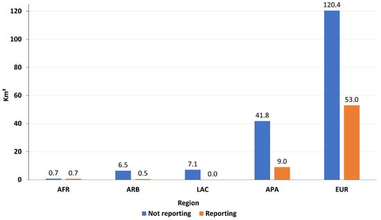 Figure 9 presents the average annual change in built-up area from 1985 to 2015 per region for properties reporting and not reporting on urban development. The figure highlights that both reporting and not reporting properties in EUR experienced significantly higher changes than in other regions. Not reporting properties showed a relatively larger increase of 120 km2 per year, while reporting properties changed by 53 km2 annually. Following this, APA regions experienced yearly changes of 42 km2 for not reporting properties and 9 km2 for properties reporting. Additionally, the ARB states recorded an average increase of 6.5 km2 per year for properties not reporting and 0.5 km2 for properties reporting. In regions such as LAC, where no properties were reporting on urban development, properties not reporting saw an average increase in the built-up area of 7 km2 per year. The region of AFR displayed the least increase, compared to other regions, with properties reporting on urban development increasing their built-up areas by 0.7 km2 and those not reporting by 0.7 km2 annually during the assessment period.