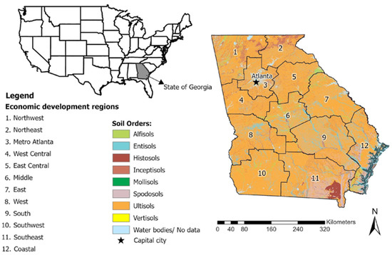 - No climate change plans for GA’s preparation and adaptation have been completed (https://www.georgetownclimate.org/adaptation/plans.html (accessed on 8 August 2024) [3]. The state of GA was awarded a $3 million noncompetitive planning grant to develop a climate action plan, which intends to generate a Priority Climate Action Plan (PCAP) by March 1, 2024, a Comprehensive Climate Action Plan (CCAP) by June 30, 2025, and a status report, due at the close of the 4-year grant period, which ends in 2027 [8,9]. Data from this study that estimates soil-based GHG emissions from land developments can support the development of a future plan. This study’s quantitative soil-based GHG emissions estimates are from both past and recent land conversions and the resulting monetary social C cost (SC-CO2) values. Also, this research quantified the area no longer available for C sequestration in GA. Prior to and before 2021, GA lost an area of 15,197.1 km2 to developments with a midpoint of 1.2 × 1011 of total soil carbon (TSC) losses and midpoint values of $20.4B (where B = billion = 109, $ = U.S. dollars (USD)) in SC-CO2. “New” land developments (3564.9 km2) that occurred from 2001 to 2021 likely caused a loss of midpoint 6.5 × 1010 kg of TSC, causing a midpoint of $11.0B SC-CO2. There is very little land (8.8% of total land area) available for nature-based C sequestration (e.g., 0.2% barren land, 4.1% shrub/scrub, 4.5% herbaceous) (Table 2). Georgia’s soils typically have low inherent potential for C sequestration because they are dominated by low-fertility and highly leached Ultisols. Projected levels of sea level rise and expected urbanization will likely reduce land availability for C sequestration further. (Addressing UN SDG 13: Climate Action);