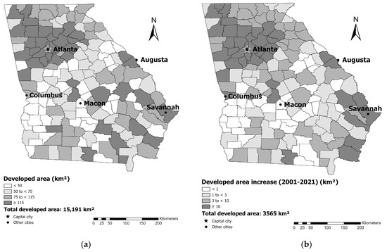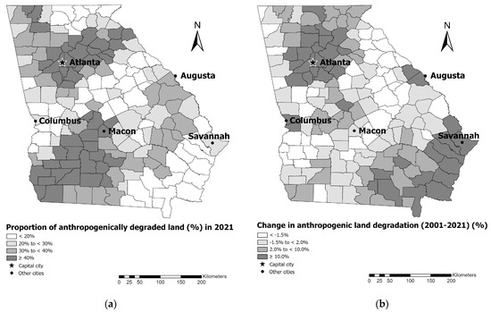 - The Revised World Soil Charter, which was endorsed by member states of the Food and Agriculture Organization (FAO), provides guidelines to ensure that “soils are managed sustainably and that degraded soils are rehabilitated or restored” [76]. This Charter calls for the limiting of soil degradation to preserve soil ecosystem services and support LDN. Our study shows that the state of GA has experienced an increase in both LD and soil degradation, as indicated in Table 4, with an overall +3.7% increase in LD between 2001 and 2021. Land and soil degradation occurred across all soil types during this study period primarily due to the rise in developments. The state of GA was not LD neutral, as indicated by the data in Table 4. This case study in GA is an important contribution to the ongoing research on climate governance [77], which should include soil governance as well [78,79,80]. (Relevant to The Revised World Soil Charter).