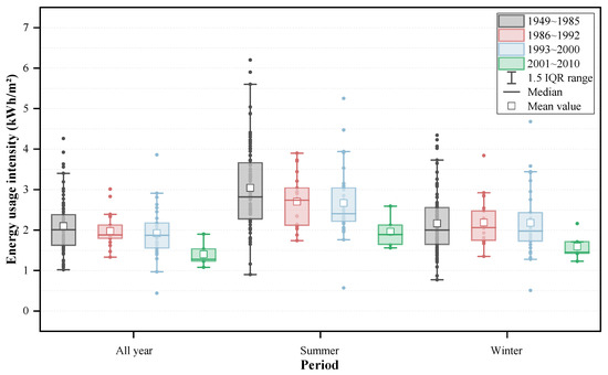 Energy consumption intensity of the sample residential buildings at different time periods.