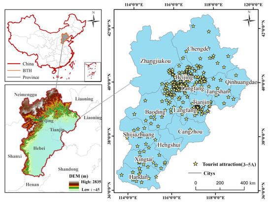 Study region. Overview of the geolocation, DEM, and tourist attractions of Beijing–Tianjin–Hebei urban agglomeration (BTHUA). There are 13 cities in BTHUA, including 2 municipalities (Beijing and Tianjin) and 11 cities of Hebei Province (Shijiazhuang, Tangshan, Qinhuangdao, Handan, Xingtai, Baoding, Zhangjiakou, Chengde, Cangzhou, Langfang, and Hengshui).