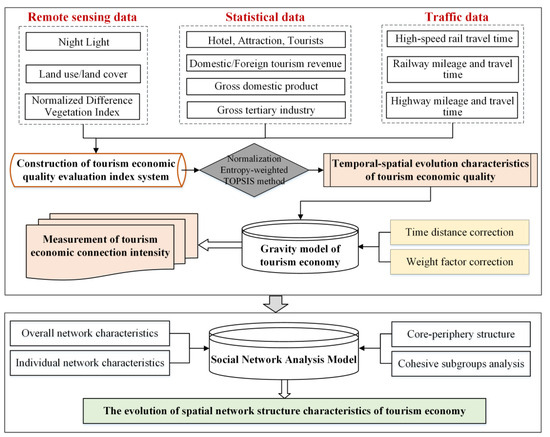 Figure 2 illustrates the empirical research flowchart for the spatial network structure of TEC in this study. First, using remote sensing data, tourism economic statistics, and traffic big data, a comprehensive evaluation index system for TEQ is developed to analyze the spatiotemporal distribution of TEQ in the BTHUA. Second, the tourism economic gravity model is refined using time distance and weight factors to investigate the spatiotemporal evolution characteristics of the ITESC and its spatial correlation network. Third, the SNA method is employed to comprehensively assess the coordinated development capacity of the TEC within the BTHUA. This analysis reveals the role and positioning of each city within the urban agglomeration, the linkage differences between cities, and the evolution characteristics of their cohesive subgroups.
