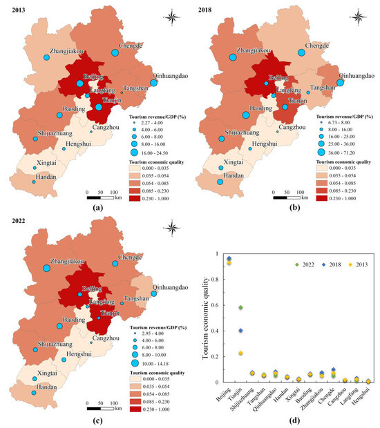 Spatial distribution of tourism economic quality and the proportion of total tourism revenue in GDP in BTH for 2013 (a), 2018 (b), and 2022 (c), and the scatter diagram of tourism economic quality of 13 cities in BTH (d).