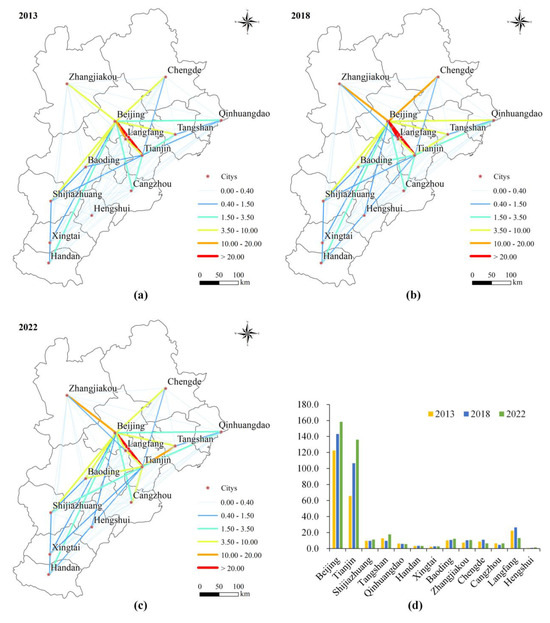 Intensity of tourism economic connection in BTH for 2013 (a), 2018 (b), and 2022 (c), and the total intensity of tourism economic connection of 13 cities in BTH (d).