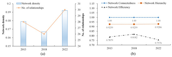 The overall network structure characteristics of the tourism economy in BTH urban agglomeration. (a) The network density and the number of relationships (No. of relationships) of the city-level tourism economy in BTH for 2013, 2018, and 2022. (b) Network connectedness, network hierarchy, and network efficiency of the city-level tourism economy in BTH for 2013, 2018, and 2022.