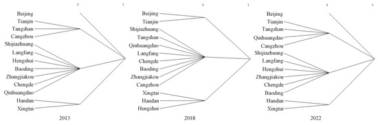 Cohesive subgroup distribution of Beijing–Tianjin–Hebei urban agglomeration for 2013, 2018, and 2022.