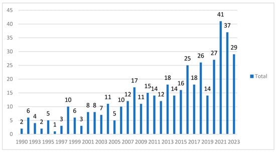 In order to identify the scientific output that studied the link between salt landscapes and tourism, we selected documents that met the inclusion and exclusion criteria and analysed the results (n = 437). The number of scientific papers recorded peaked in 2021 at 41 papers, descending in 2022 to 37 papers, and in 2023 (in the first ten months) to 29 papers. The publication production followed an increasing trend that has become more visible since 2001 (Figure 2). From the 437 papers included in our analysis, 200 received funding for publication.
