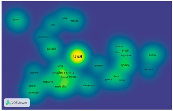 To identify the main contributors to scientific output regarding the use of salt resources in tourism, we built a co-authorship network based on country, considering at least four documents as a minimum number of documents for a country to be considered (Figure 3). Of the 83 countries, 36 met this threshold. The top five countries identified with the highest link-strength were the USA (link-strength = 50; 110 documents; 2461 citations), Spain (link-strength = 27; 32 papers; 787 citations), Canada (link-strength = 22; 24 documents; 602 citations), France (link-strength = 22; 16 papers; 606 citations), and Sweden (link-strength = 19; 10 documents; 215 citations).
