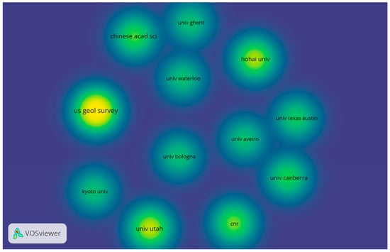 To build a co-authorship network based on the authors’ affiliation, we considered the institutions with at least four documents (Figure 4). Of the 174 organisations, 17 met this threshold. In terms of academic production from the affiliated institution, the main five research institutions that published studies about the connection between tourism and exploiting salt resources were the U.S. Geological Survey (10 documents; 405 citations), the University of Utah (7 papers; 106 citations), the Chinese Academy of Sciences (7 documents; 55 citations), the University of Canberra (6 papers; 84 citations), and Hohai University (6 documents; 59 citations).