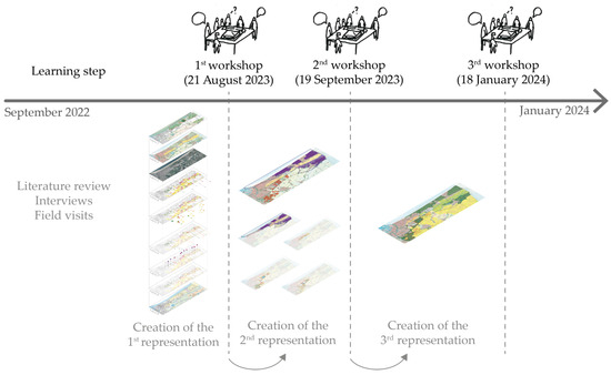The experiment with multi-stakeholder spatial projection for the UCD began with learning about the territory through two field visits and interviews with the managers of the UCD and the local Chamber of Agriculture. The aim of this step was to better understand the UCD’s specific characteristics to adapt the implementation of multi-stakeholder spatial projection. Next, three collective workshops were held based on the new spatial representations of the territory. Two databases were developed during the experiment. The first contained data from the discussions with stakeholders during interviews and workshops in the form of audio recordings and written reports. The second contained the data from the projection process and the documents produced during its steps, specifically the spatial representations produced to support the three collective workshops and the descriptions of how the process was developed, in the form of logbooks and written intermediate summaries. These two databases were analysed qualitatively [49] to understand how the principles of the multi-stakeholder spatial projection process became part of an ongoing process within a local authority and to discuss the strengths, limitations, and possible future developments of this new framework. The experiment and its results are presented as a chronological narrative (Figure 2).