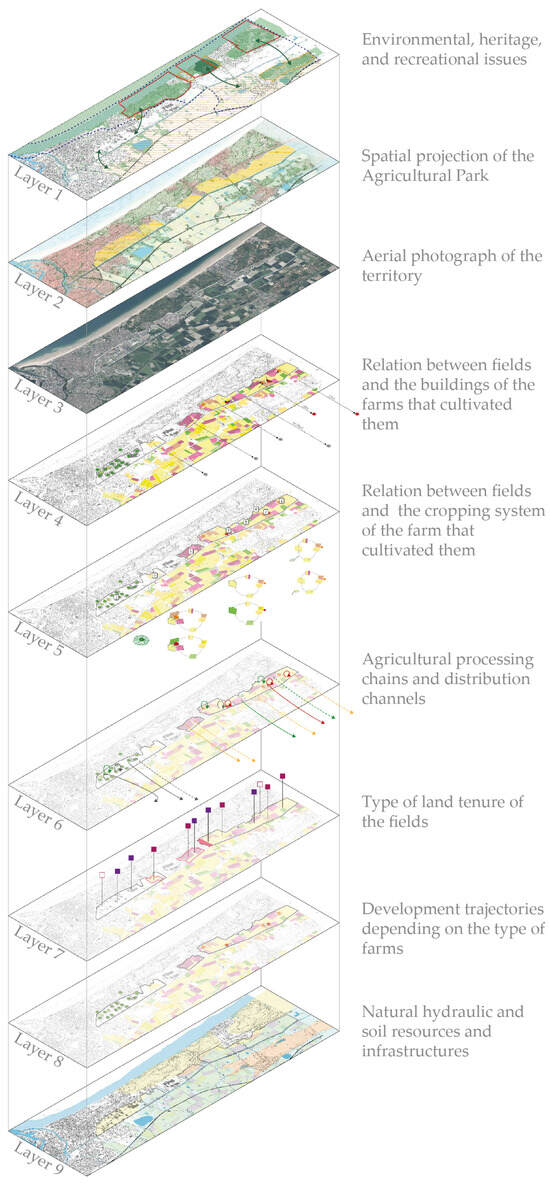 - Layer 4 represented how the fields located within the Agricultural Park boundary are related to the buildings of the farms that cultivated them. These buildings could be located near the cultivated fields or several kilometres away. In the eastern end of the Agricultural Park, occupied by mixed-crop and mixed crop–livestock farms, most buildings were located outside of the Agricultural Park boundary. The changes in these cultivated areas for the Agricultural Park project thus needed to consider places located outside of the boundary.