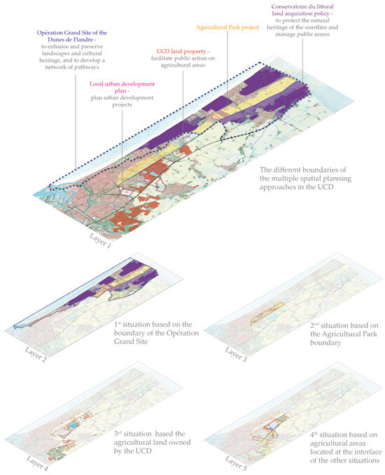 - Layer 2—The first situation was based on the boundary of the Opération Grand Site of the Dunes de Flandre, which included that of the Conservatoire du littoral’s (i.e., coastal protection agency’s) land-acquisition policy and the eastern part of the Agricultural Park boundary. This boundary defined a situation in which the preservation of natural areas, ecological network, and landscape enhancement and the development of walking areas applied to the agricultural areas cultivated by mixed-crop and mixed crop–livestock farms. In this situation, the absence of public land in agricultural areas limited the UCD’s courses of action.