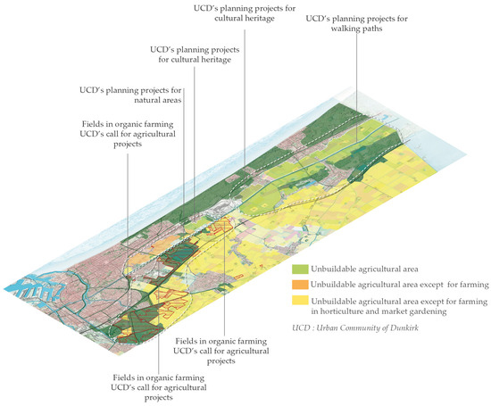 The local authority of the UCD, a dynamic urban territory of ca. 300 km2, is located on the coast of northern France (51°02′18″ N, 2°22′39″ E) and has a population of ca. 192 600 inhabitants. It experiences high pressure for the use of space due to the overlapping of major and expanding industrial activities, the development of port activities, urban development, intensive agriculture, tourism, and landscape and natural protected areas. Agriculture is characterised by crop and livestock farming mainly included in the industrial value chains, and industrial horticultural production to the east of Dunkirk. The market gardening, historically present in this area, has been declining for many years, and only two farms remain in the middle of the horticultural area (Figure 1).