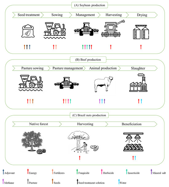 The general structure of the system limits evaluated in this study. (A) Production of soybean; (B) Production of beef under an extensive system; (C) Production of Brazil nuts.