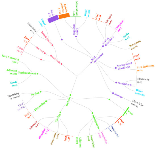 Life cycle inventory data for the raw materials evaluated were derived from the literature. The energy, chemical, and other nutrient requirements necessary for soybean and beef production operations are detailed in Table 1 and Table 2, respectively. Soybean was analyzed from the perspective of direct sowing; therefore, there was no need to prepare/turn the soil before sowing. The grain drying stage was considered in silos for the time necessary to reach the appropriate moisture content. In meat production, the sowing of Brachiaria pastures was taken into consideration since it is the main food base. In beef processing, the minimum time for basic cooling was considered. Brazil nuts were taken into consideration as being part of the native forest of the Amazon biome, so there were no material and energy requirements in the planting stages. However, requirements related to harvesting were considered. In the processing of Brazil nuts, the selection, cleaning, and drying stages were considered mechanized (Table 3).