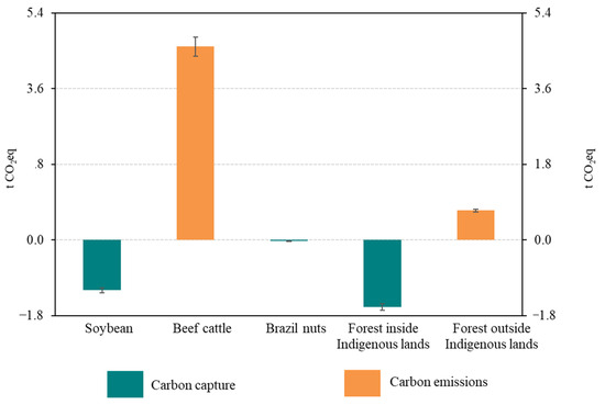 In parallel, when evaluating the life cycle of soybean, beef, and Brazil nuts production, it is important to consider not only the emissions associated with production activities but also the potential benefit, and enteric emissions from the digestion of ruminants in the case of beef cattle farming. This can provide exquisite details about the net impact of these activities and the forest. In this sense, Figure 4 presents the values of the CO2eq balance for the production of soybean, beef, Brazil nuts, and the native forest.