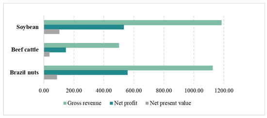 As shown in Figure 5, the values obtained for the net profit per hectare per year for the production of soybean, beef, and Brazil nuts were USD 533.94, USD 146.19, and USD 559.21, respectively. As can be seen, all activities obtained a positive net present value (NPV). However, the best results in the analysis of the NPV, that is, the value of additional net income obtained, were from the production of soybean with USD 103, followed by the production of Brazil nuts with USD 87.22, and finally production of beef cattle with USD 37.61. The generation of a lower value of additional net income through soybean production in relation to Brazil nuts extraction is often related to management issues. The challenging process of managing agricultural crops due to the presence of pests, diseases, climate, and the need to make the activity increasingly mechanized can lead to a low economic return from agricultural production [62,63].