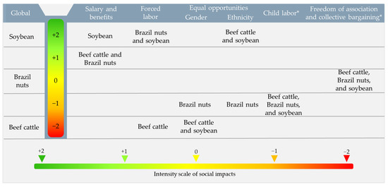 Classification of the social life cycle analysis of the commodities soybean, beef cattle, and Brazil nuts at the level of the northern region of Brazil. Scale: +2: ideal performance; +1: beyond compliance; 0: compliance with local and international laws and basic social expectations; −1: slightly below the level of compliance; −2: totally below the level of compliance. * Corresponds to data from the primary sector, covering all activities related to agriculture, livestock, plant, and mineral extraction.