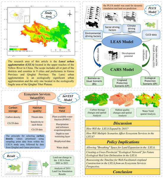 The Qinghai-Tibet Plateau (QTP), one of the most ecologically fragile areas in the world, is characterized by high altitude, cold temperatures, low precipitation, simple ecosystem structure, and weak resistance to disturbances [1]. The Lanzhou-Xining Urban Agglomeration (LXUA) is the only urban agglomeration designated by the Chinese government to be located in the ecologically fragile area of the Qinghai-Tibet Plateau. In the past 2 decades of development, the trajectory of the LXUA has reflected the urban development challenges faced by many cities in western China, profoundly affecting the regional land use structure and has made the ecological sustainable development of the ecologically fragile areas of the Qinghai-Tibet Plateau a complex issue. Conflicts and negotiations among urban expansion, ecological protection, and cropland preservation have been persistent issues throughout the growth of urban agglomeration. In 2001, the Chinese government initiated the Western Development Strategy, which included increasing investment in infrastructure construction in regions such as Qinghai Province and Gansu Province through central financial transfers and guidance to promote urbanization and resource development. According to the Western Development Strategy, the plan was divided into three phases: laying the foundation (2001), accelerating development (2011), and achieving modernization (2031) [2]. However, the actual implementation proved to be more complex than anticipated. The aggressive urban construction and development process led to an overemphasis on industrialization and an over-reliance on fixed asset investment and foreign investment. These factors continuously stimulated urban expansion demands and regional urban cooperation while posing potential threats to regional ecological security [3].