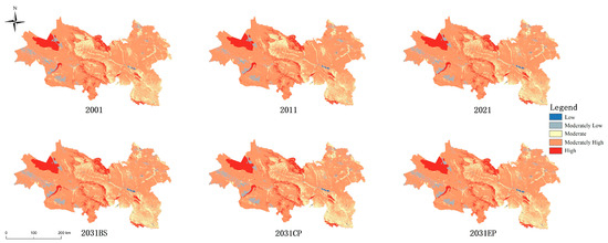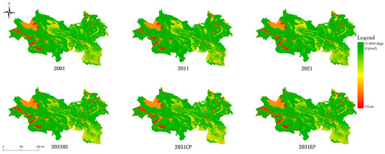 The average habitat quality in 2001, 2011, and 2021 was 0.7130, while the simulated average habitat quality in 2031 for the three scenarios was 0.7098, indicating a decline (Table 10). Spatially, habitat quality was divided into five levels: low (0–0.2), relatively low (0.2–0.4), medium (0.4–0.6), relatively high (0.6–0.8), and high (0.8–1), as shown in Figure 7. The spatial distribution of habitat quality is closely related to land use, with high-quality areas concentrated in Forest and Water, relatively high-quality areas in Grassland, medium-quality areas in Cropland, relatively low-quality areas in Barren, and low-quality areas in Impervious land.