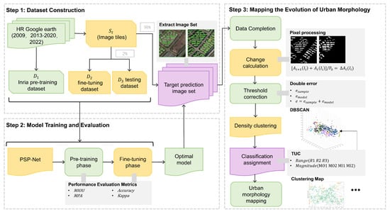 In this study, we divided our workflow into three steps to understand the spatiotemporal evolution of urban morphology at the meso- and microscale. First, we created a method for constructing urban form datasets for evolution analysis. Second, we effectively extracted the urban morphology by training a deep learning semantic segmentation model; Finally, we quantified the changes in urban morphology using the TUC classification system and abstracted the evolution patterns.