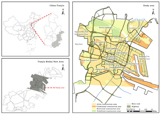 This research focuses on the Binhai New Area in Tianjin, China, a district under the jurisdiction of Tianjin and functioning as a satellite city. It is located in the eastern part of mainland China along the Bohai Sea area Figure 2. As the third major economic growth zone in China, following the Shenzhen Special Economic Zone and Shanghai Pudong New Area, Tianjin’s Binhai New Area has experienced a period of rapid economic and population growth. The population increase is concentrated in the central part around the Haihe River, stretching from east to west along the downstream of the river. We strategically selected the central urban area of this district as the subject of this study. It meets our research needs well: (1) The city is mainly in the stage of stock development, but at the same time accompanied by a certain degree of urban expansion. Therefore, the city shows a diverse urban form, which is highly representative of the study. (2) The study area is designated as a high-density urban center, usually one of the first developed areas of a city. Compared to other parts of the city, changes in these central urban areas are smaller in scale. So this is an ideal test environment to evaluate the recognition accuracy of the deep learning model and the robustness of the framework for analyzing the evolution of urban form.