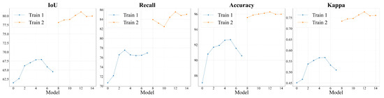 To further improve the segmentation accuracy of the model on specific sites, the dataset was used to fine-tune the best-performing pre-trained deep learning model 6. After 1200 training epochs, we observed overfitting in model 14. Consequently, the superior model 13 was selected. The performance of the fine-tuned model is detailed in Table 6. The results show a significant improvement in the performance of the model during our training (Figure 4), with the kappa value of model 13 approaching the “almost perfect” criterion. This model demonstrates excellent performance in processing urban satellite images of different years, seasons, and variations in hue, clarity, and saturation. Additionally, the model effectively handles various types of urban forms, including rural buildings, densely built urban areas, and large industrial facilities Figure 5.