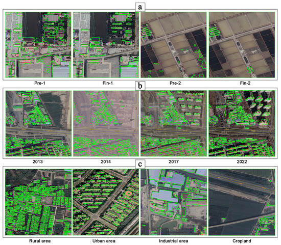 Building extraction results of image tiles. (a) Comparison of the effect of the same recognized image after pre-training and fine-tuning training. (b) A comparison of the effects under different years, seasons, hues, saturation, and clarity. (c) A comparison of the results for different types of urban morphology, including rural areas, dense urban areas, farmland, and factories.