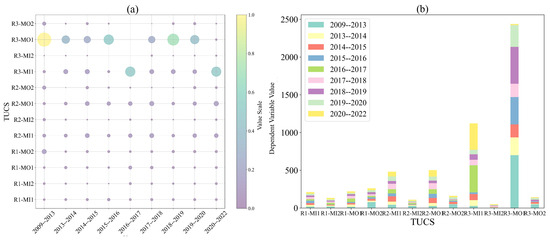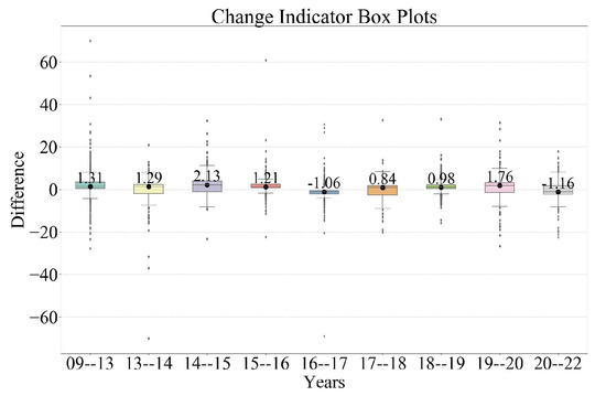 M: , the change magnitude dimension, used to describe changes in building area within tile. The M indicator is divided into two categories and two levels, with the classification of levels related to the tile occupying more than half of the interval values within the cluster: represents a decrease in change; represents an increase in change. The critical value q for the division between the first and second levels is defined by the average of the third quartile of the yearly change difference distribution , which allows the second-level indicators and to exhibit more significant changes compared to the first-level indicators and .