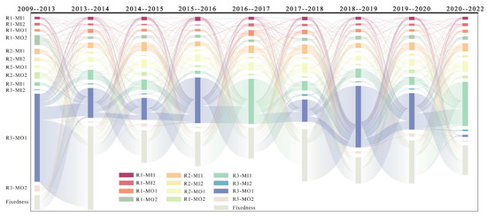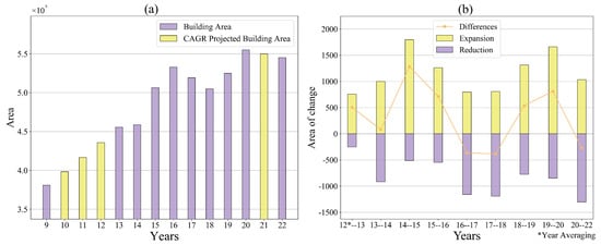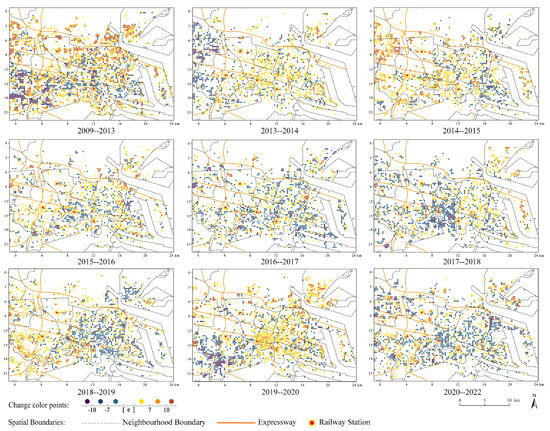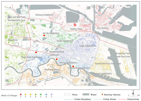 This framework has certain limitations. We acknowledge that simplifying urban form into architectural elements does not fully capture all physical manifestations of urban morphology. Absolute representation of urban form often faces complexity challenges and cannot be entirely represented by a single category [18,58]. However, because buildings dominate the urban landscape, changes in building area are the most suitable mapping carriers for urban morphology evolution. Compared to plots or roads, it is a more unstable element in cities, showing more significant changes in short sequences. Additionally, as the main carriers of human production and living activities, they offer stronger interpretive power regarding socio-economic activities than other urban elements [67,68,69].