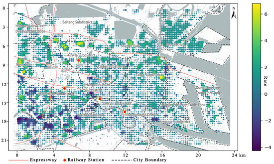 The linear development pattern is usually closely related to transportation and logistics demand. The city’s geographic characteristics, transportation arteries, and economic activity are important factors in shaping this pattern. For instance, if a city has important development plans in a certain direction, the associated supply chain, services, and housing industry may concentrate in that direction. This clustering effect promotes the development of cities along specific axes, exacerbating the trend of linear expansion [62,63]. Additionally, residential areas in this region, due to their proximity to major transportation and logistics hubs, face environmental pressures such as noise, exhaust emissions, and pollution from frequent construction, which affect the quality of life and health of residents. Therefore, exploring the relationship between linear urban development patterns and residents’ quality of life can help improve the living environment and promote rational urban planning. Coincidentally, this area is adjacent to the edge areal expansion pattern on the map. In future research, the interconnections between urban expansion areas and linear urban development patterns can be further explored to optimize urban planning and land use strategies.