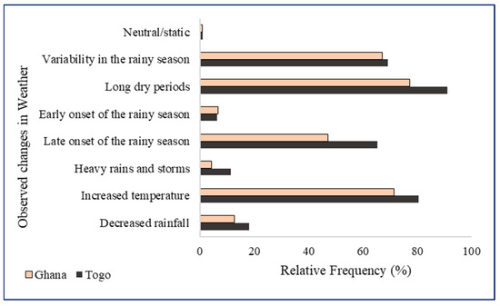Figure 2 shows that cocoa farmers in the study area have a good understanding of climate challenges and perceive drought as a significant threat to cocoa production and their livelihoods, among other limiting factors. Most farmers (60–80%) perceived an increased frequency of drought over the past four decades and considered changes in rainfall patterns, rising temperatures, and deforestation to be contributing factors (Figure 3). There were no significant differences in drought perceptions between farmers in the Ghana and Togo regions (p-value = 0.747). Evidence of drought and climate-related phenomena could explain these similarities in the awareness of drought issues. The knowledge of the farmer about drought also highlights its understanding based on experience and the crucial importance of addressing the drought challenge.