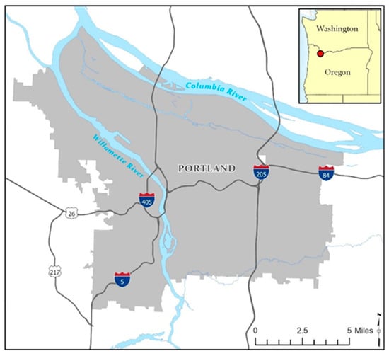 The City of Portland, OR is located in the Pacific Northwest region of the United States. The city is located approximately 45.5° N, 122.6° W and is situated at the confluence of the Willamette and Columbia Rivers at the beginning of the Willamette Valley (Figure 1). The city boundaries cover approximately 145 square miles, including 133.5 square miles of land cover and 11.5 square miles of water cover, and it has a total population of 652,503 as of 2020 []. Land use in the city is predominately residential zoning, comprised of low–medium-density single and multifamily residential homes, making up approximately 52% of the city’s total area [].