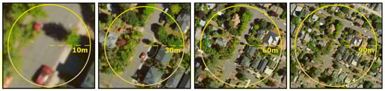 The CAPA_NIHHIS Portland Metro Heat Watch campaign collected over 269,000 temperature point measurements throughout the greater Portland Metro region in total between the three vehicle traverse routes, which were each conducted for one hour at 6 am, 3 p.m., and 7 p.m. []. Through analysis in ArcGIS Pro 3.3, temperature points were only kept in the Portland city boundary, providing a total of 29,128 morning temperature points, 25,191 afternoon temperature points, and 28,034 evening temperature points, with sensors recording temperatures every second. Because of the measurement frequency, considerable temporal and spatial autocorrelation needed to be accounted for, with every 100th temperature point being selected, equally spacing temperature measurements in time and providing a spatially diverse sample size [,]. Buffer zones, determining the scale of analysis, were set at 10, 30, 60, and 90 m from the selected temperature points to represent scales of an approximate single property or street corridor (10 m) to a city block (90 m) (Figure 2).