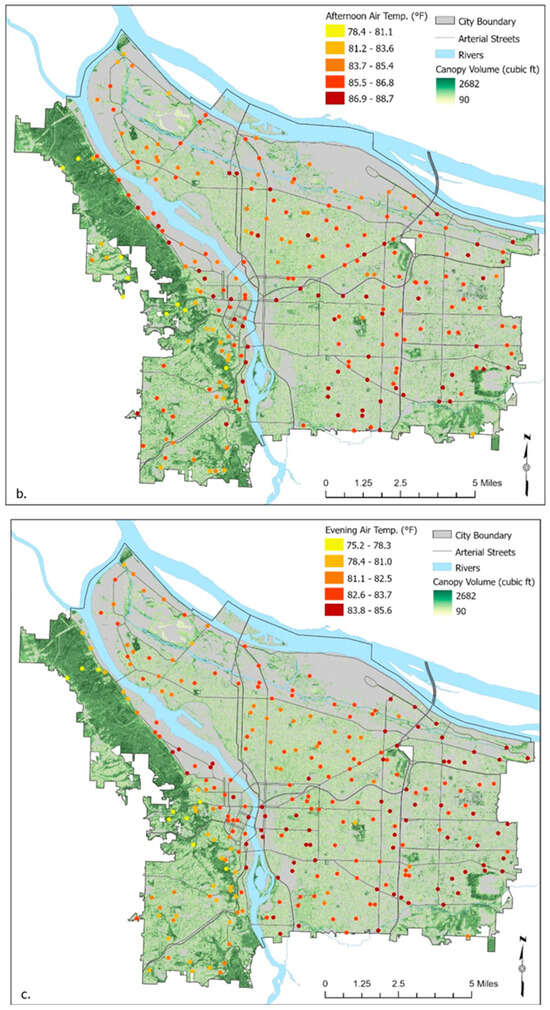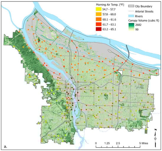 The uniqueness of this study lies in the three-dimensional component of considering canopy volume across multiple times of the day while examining canopy and impervious surface coverage at intraurban scales of analysis and using near-surface air temperature rather than land surface temperature derived from remote sensing. With urban heat island literature predominantly focusing on urban–rural differences, using near-surface air temperature data and localized scales of analysis at intraurban scales allowed this study to continue to build a body of knowledge showing that the difference in air temperature within urban environments is as large as the well-known urban–rural difference. A 10.36° F average difference in near-surface air temperature was recorded in the city of Portland, OR during all times of day.