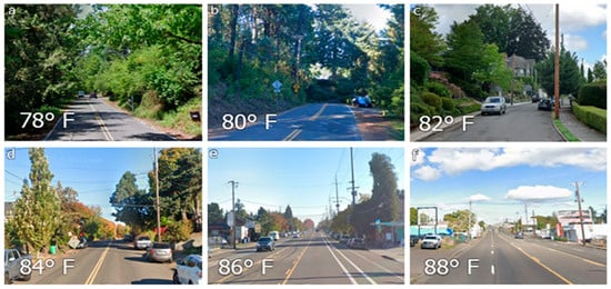 Afternoon temperature data demonstrating variation in air temperature with changing land cover throughout Portland, OR. (a) NW Skyline Blvd; (b) SW Fairview Blvd; (c) SW Champlain Dr; (d) NE Mason St; (e) NE Killingsworth St; (f) SE 82nd Ave.