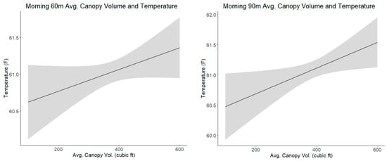 Estimated effect of avg. canopy volume on near-surface temperature at 60 and 90 m scales of analysis for morning temperatures (10, 30 m scale of analysis omitted due to models showing they were not significant predictors of temperature). Black lines represent the mean, and shaded areas represent the 95% confidence interval.