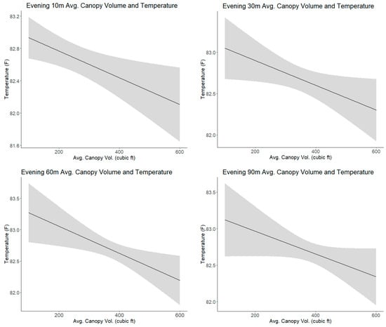 Derived from the multivariate regression models, the average canopy volume in the morning at the 60 and 90 m scales of analysis had an approximately 0.8–1° F increase effect on the near-surface air temperature for every 500 cubic feet in canopy volume (Figure 5). During the evening, the average canopy volume had an approximately 1° F decrease effect on the near-surface air temperature for every 500 cubic feet of canopy volume at all scales of analysis (10, 30, 60, 90 m) (Figure 6).