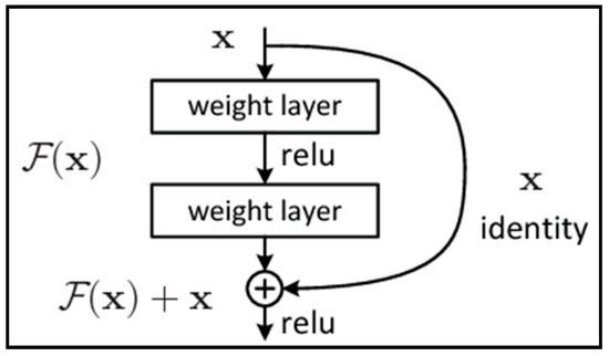 Deep networks integrate low-, medium-, and high-level features and classifiers as multi-layers [38]. The number of stacked layers explains the depth of the network. However, when the network depth increases, the accuracy saturates and degrades rapidly [38]. The Resnet 34 is a pre-trained image classification model (structured as a 34-layer convolution neural network) designed to address the degradation problem by introducing a deep residual learning framework [38]. As described in He et al. [38], the mapping function is H(x), and stacked non-linear layers fit into the mapping of F(x) = H(x) − x, then H(x) can be written as F(x) + x. The residual mapping will be optimized to reach zero (Figure 3). He et al. [38] identified plain and residual networks with 34 weighted layers following this concept. Hence, the network is solving the issue of vanishing gradient.