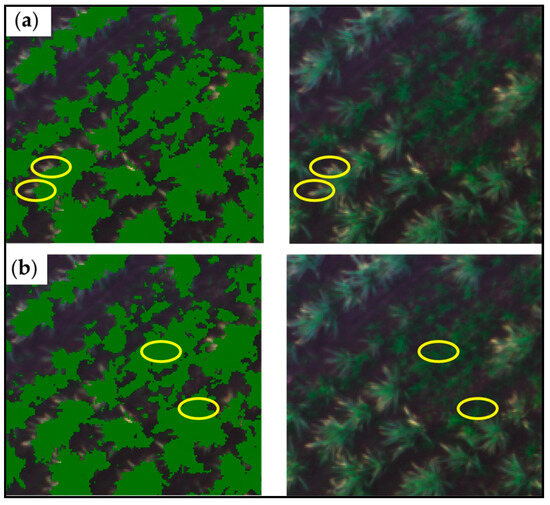 Separating vegetation and soil coverages using the Normalized Difference Vegetation Index. The left column shows the separated vegetation coverage superimposed with the image, and the right column shows the remotely sensed image. (a) An example of undetected sugarcane leaf edges; (b) successful vegetation detection.